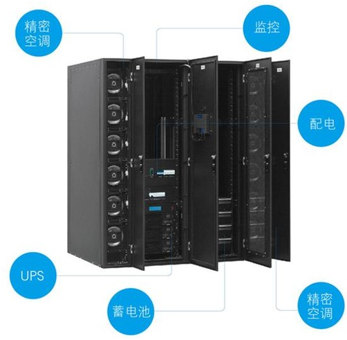 ●一體化集成小型模塊化數據中心,集成了IT主機柜(集成UPS、配電、監控)、精密空調、蓄電池柜
